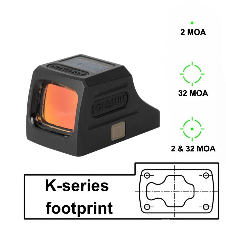 Esta mira de punto rojo utiliza el estándar de footprint Holosun K-Series.