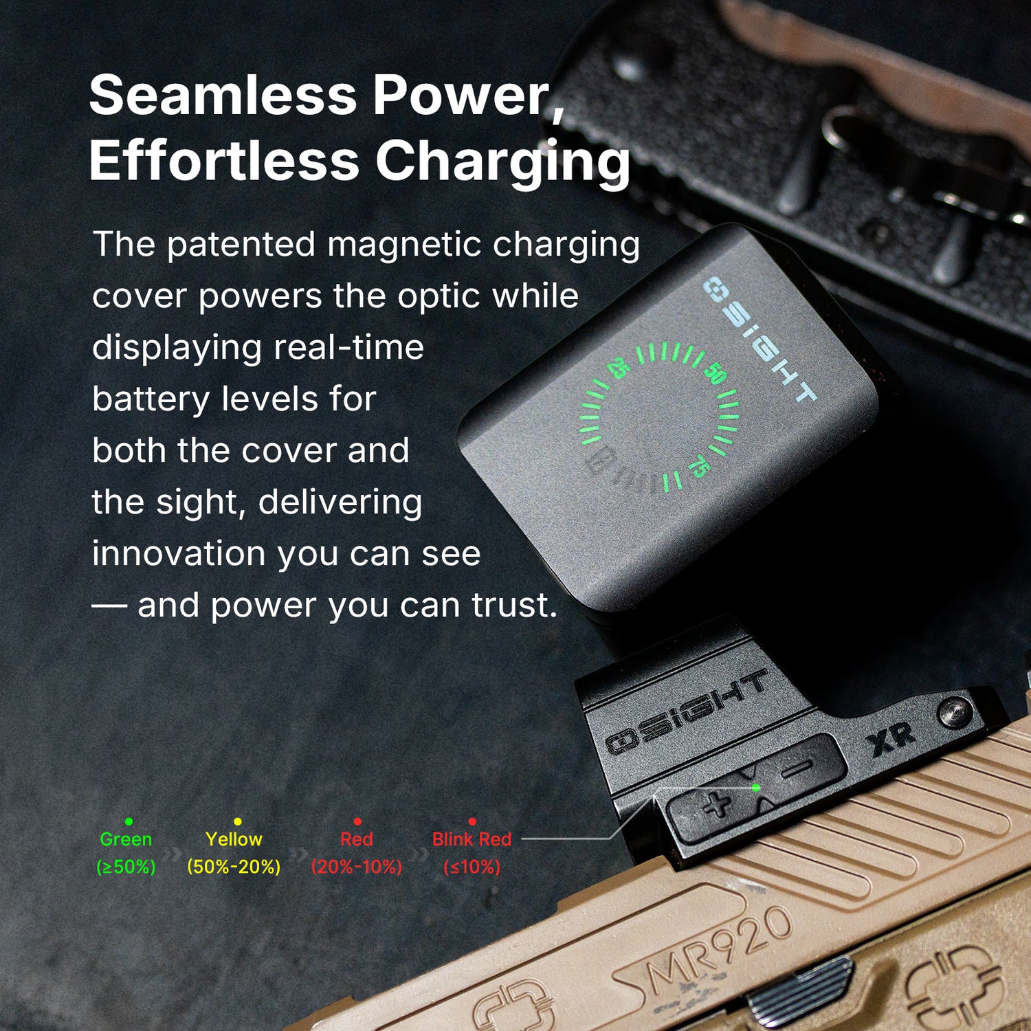 La Osight XR incluye una tapa de carga magnética que hace más que solo proteger la óptica. Carga la mira y muestra el nivel de batería tanto de la tapa como de la propia óptica, para que puedas comprobar el estado de la energía rápidamente sin adivinar. Es una idea sencilla, pero que facilita mucho el uso diario.